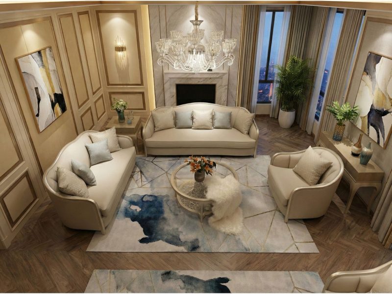 Lấy tông màu trắng kem làm chủ đạo với chất liệu da bò tự nhiên cùng khung gỗ từ sồi. Bộ sofa dát vàng thể hiện sự tinh khôi của phòng khách. Với thiết kế tân cổ điển cùng với sự trạm trổ tỉ mỉ của các nghệ nhân lành nghề, nó biến căn phòng khách thành một cung điện thu nhỏ.