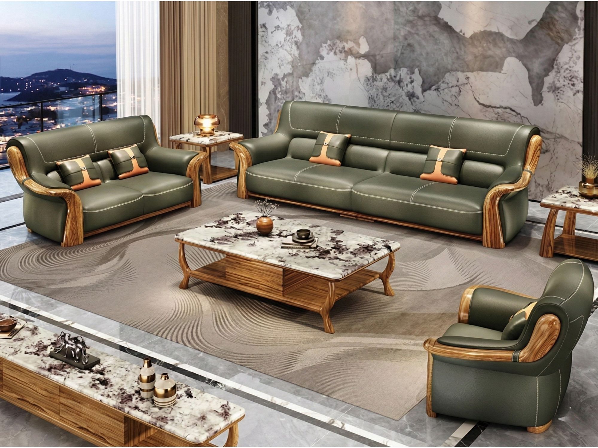 | Chất liệu | Khung gỗ Mun tự nhiên, bọc da bò tự nhiên toàn bộ bề mặt tiếp xúc, phần không tiếp xúc bọc da nhân tạo cao cấp, |