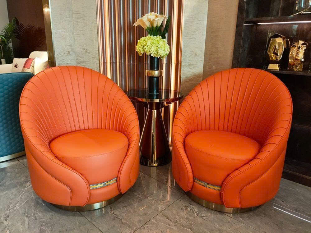 | Chất liệu | Chân thép không gỉ màu vàng Sampanh, bọc da nappa nhẹ sang trọng với họa tiết xếp nếp bằng tay |
