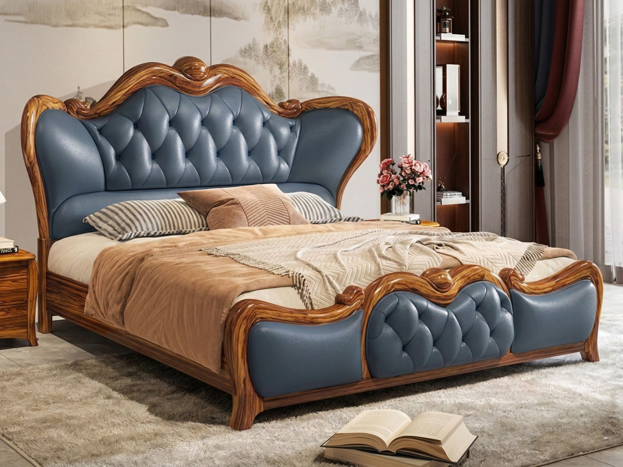 | Chất liệu | Khung gỗ Mun tự nhiên, bọc da bò tự nhiên toàn bộ bề mặt tiếp xúc đầu giường, phần không tiếp xúc bọc da nhân tạo cao cấp. |
