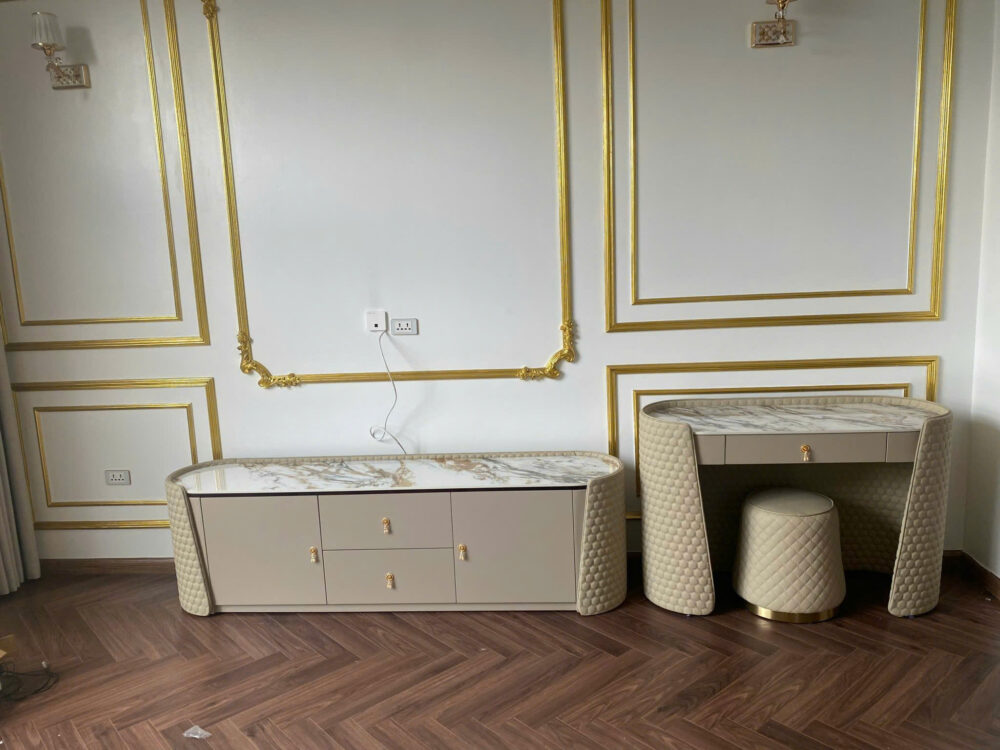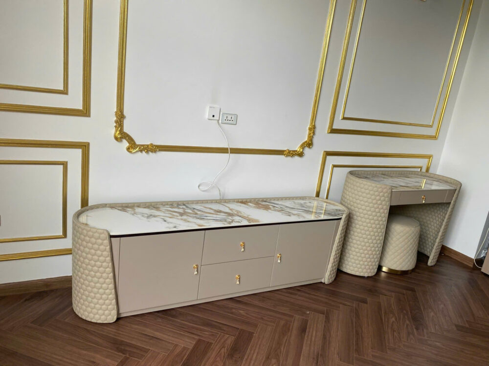 | Chất liệu | Khung gỗ tự nhiên, bọc da làm thủ công,mặt đá sang trọng |