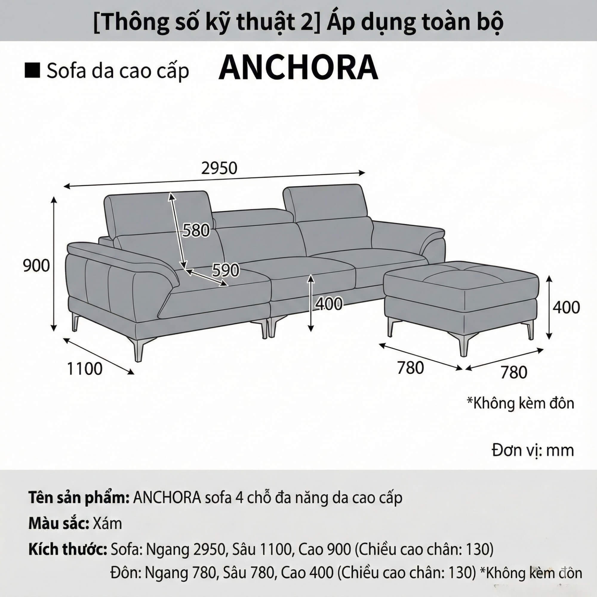 Sofa ANCHORA có kích thước 2950mm chiều ngang – con số vàng cho một bộ sofa 4 chỗ. Kích thước này giúp phòng khách trở nên rộng rãi và thoáng mát, đồng thời vừa đủ để cả gia đình quây quần bên nhau.