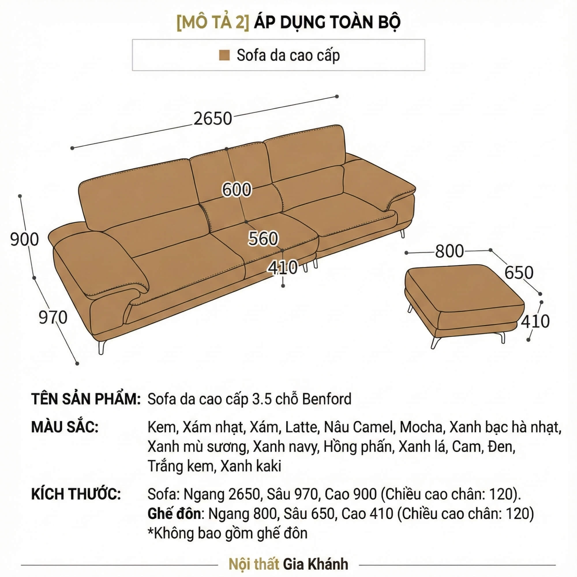 - BENFORD 3.5 chỗ – Sofa da cao cấp (2650 x 970 x 900mm, chân cao 120mm)