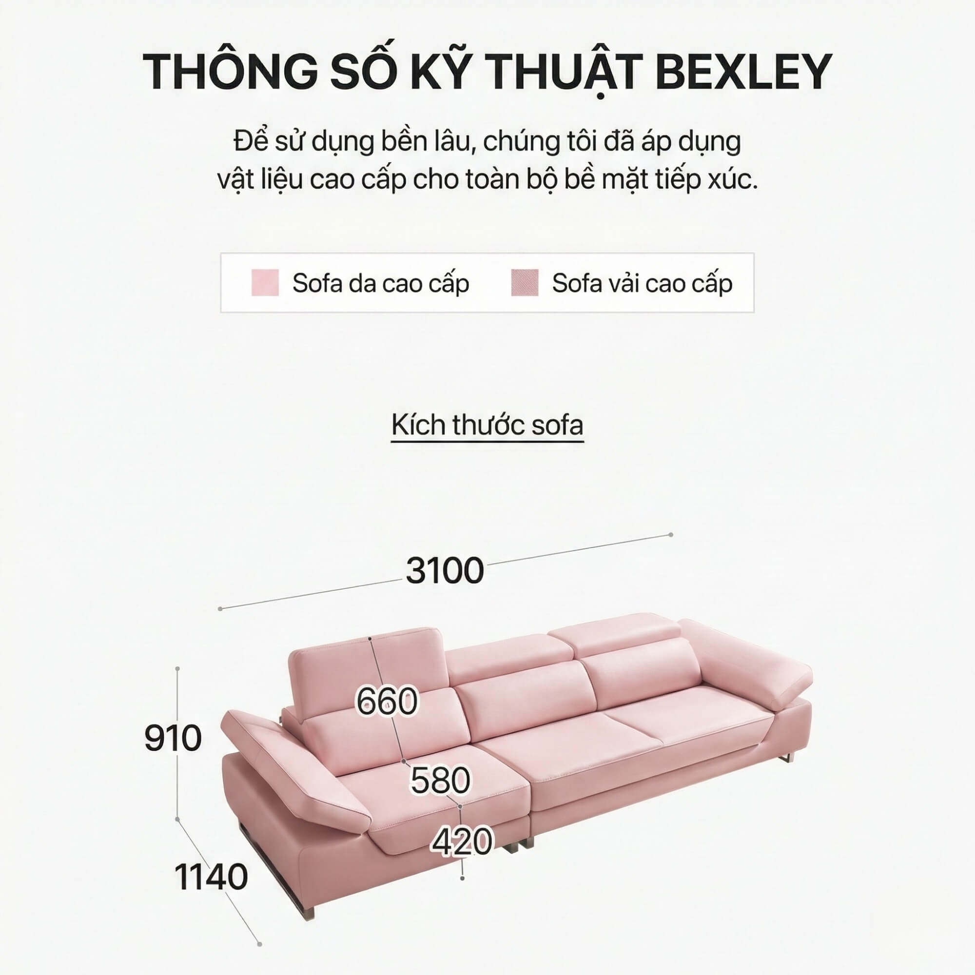 Với kích thước 4 chỗ ngồi phổ biến (chiều rộng 3100mm), BEXLEY cho phép bạn thoải mái sử dụng trong các phòng khách rộng rãi mà không lo bị chật chội. Đây chính là lựa chọn lý tưởng khi bạn muốn sở hữu một bộ sofa vừa đẹp mắt vừa tiện dụng.