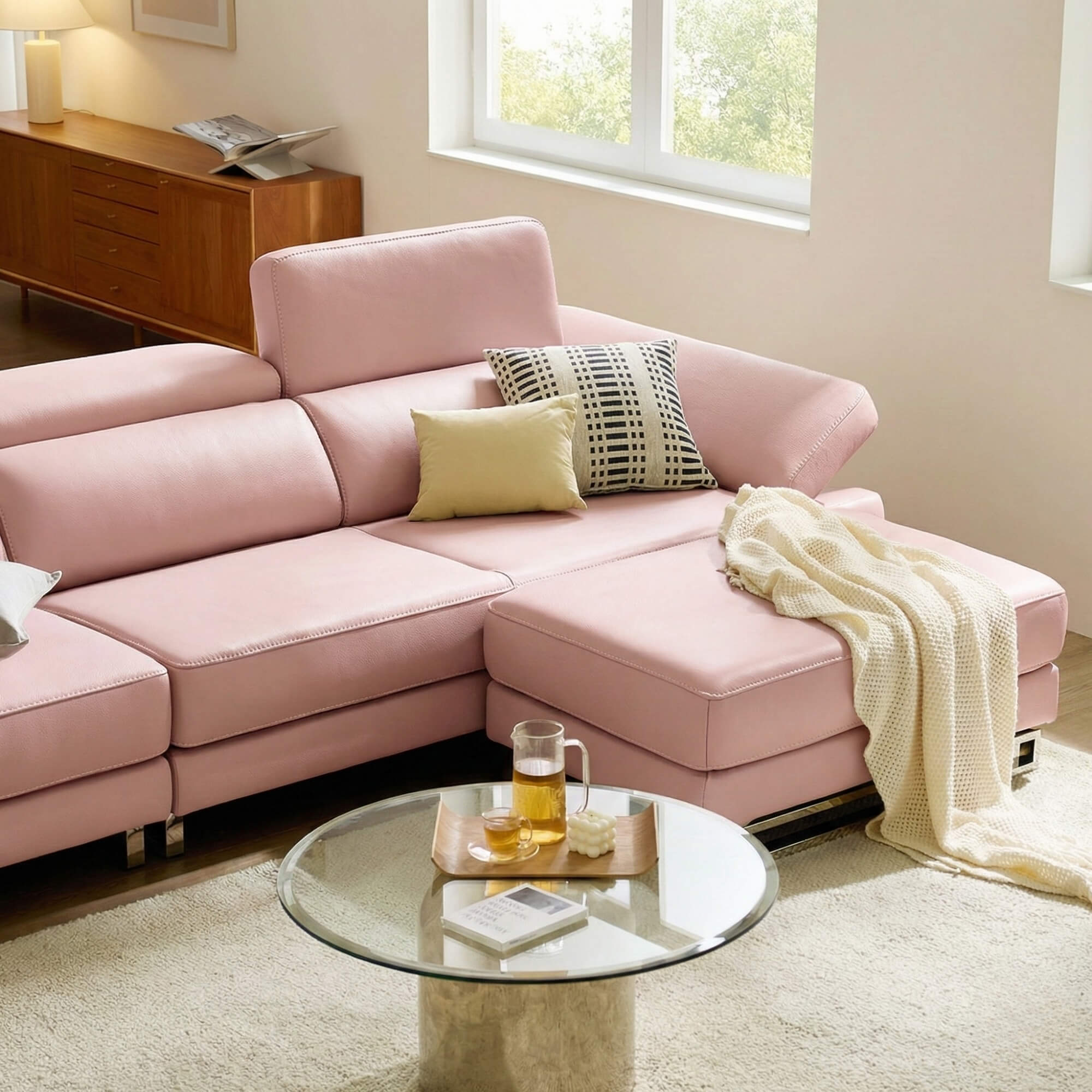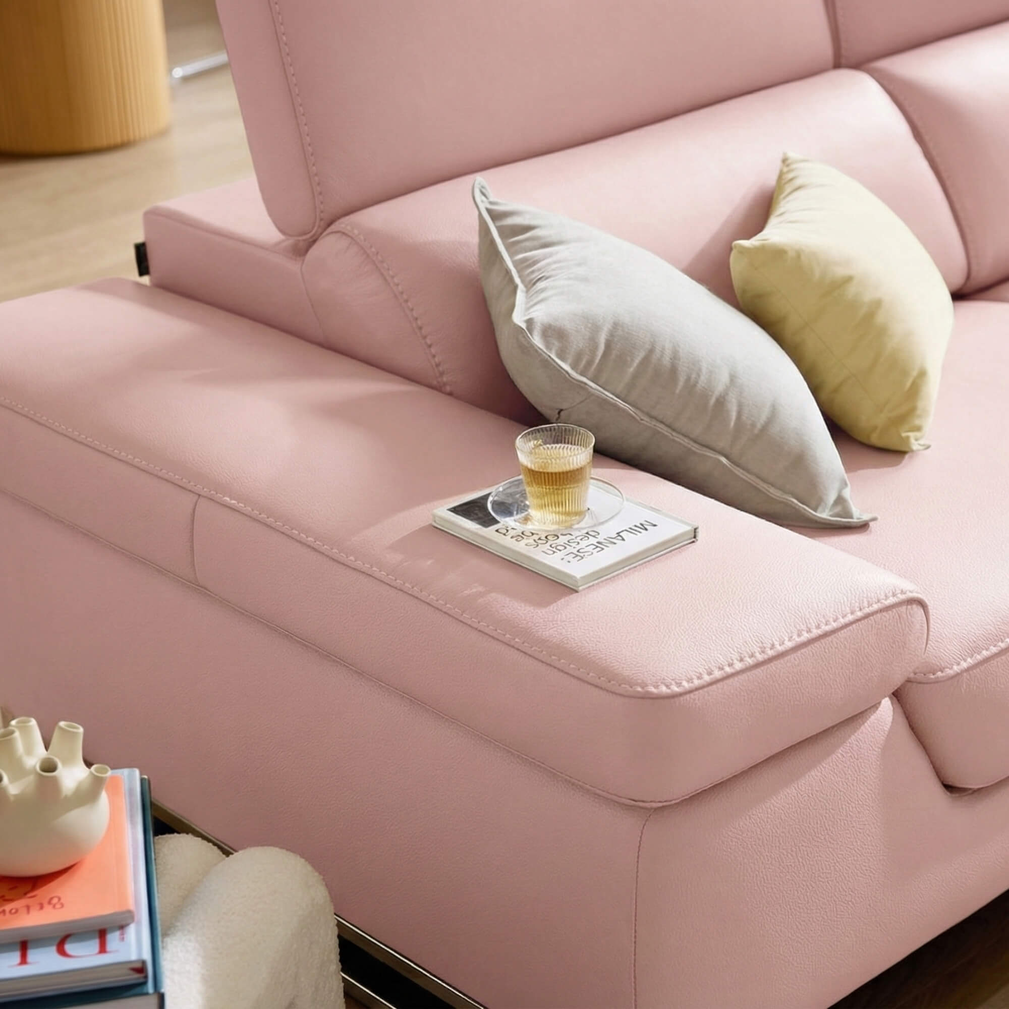 Chức năng tay vịn cũng có thể điều chỉnh theo góc độ mong muốn, giúp tối ưu hóa không gian và mang lại cảm giác hiện đại. Khi hạ tất cả các tựa đầu xuống, phòng khách sẽ trở nên rộng rãi hơn, tạo cảm giác thoáng đãng cho căn phòng.