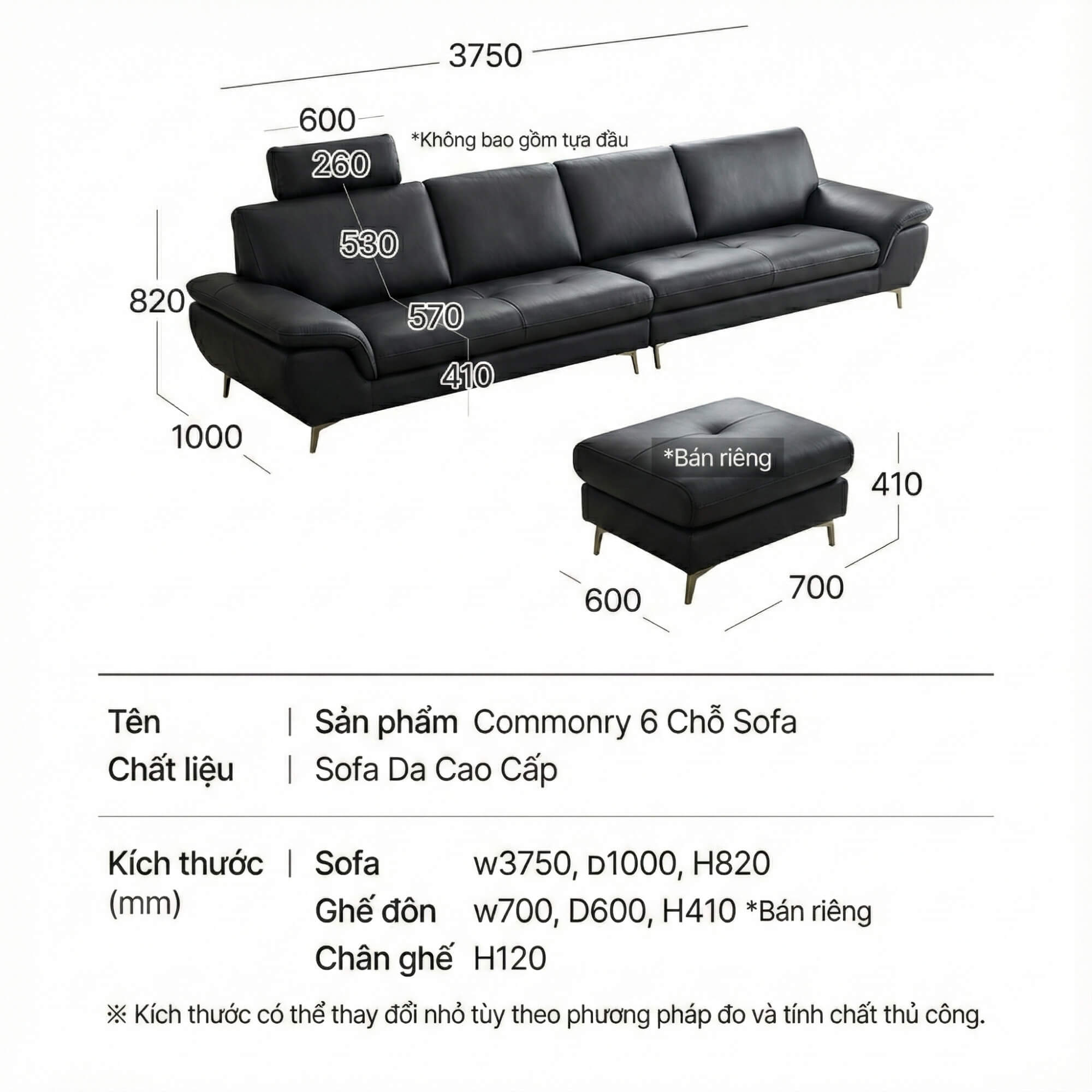 - Ghế đơn: W700, D600, H410 (Bán riêng)