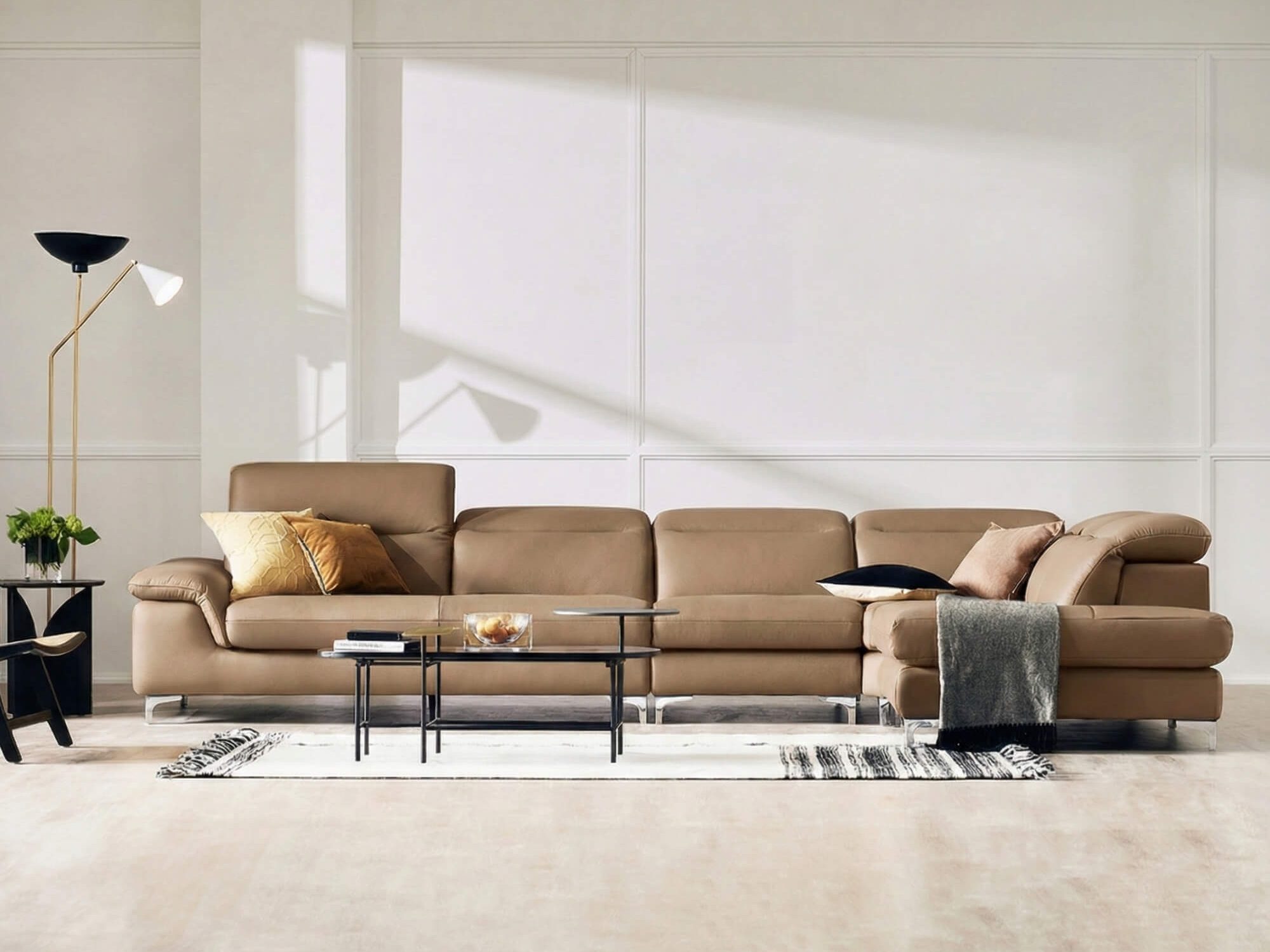 Thiết kế 6 chỗ góc L chức năng sofa da cao cấp này phù hợp với phòng khách rộng, tạo điểm nhấn cho không gian mà không làm mất đi sự thông thoáng.