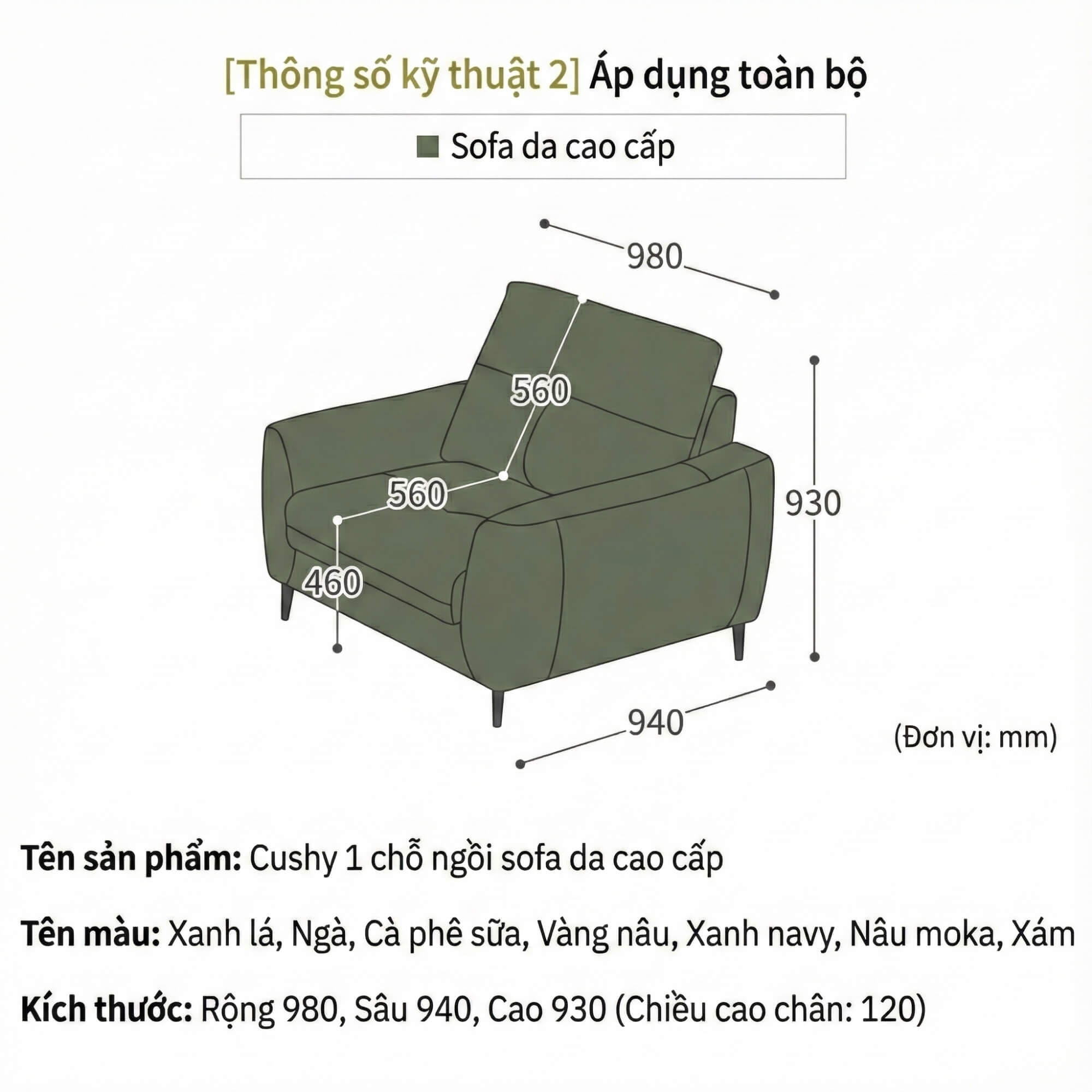 - Cao: 930mm (Chiều cao chân: 120mm)