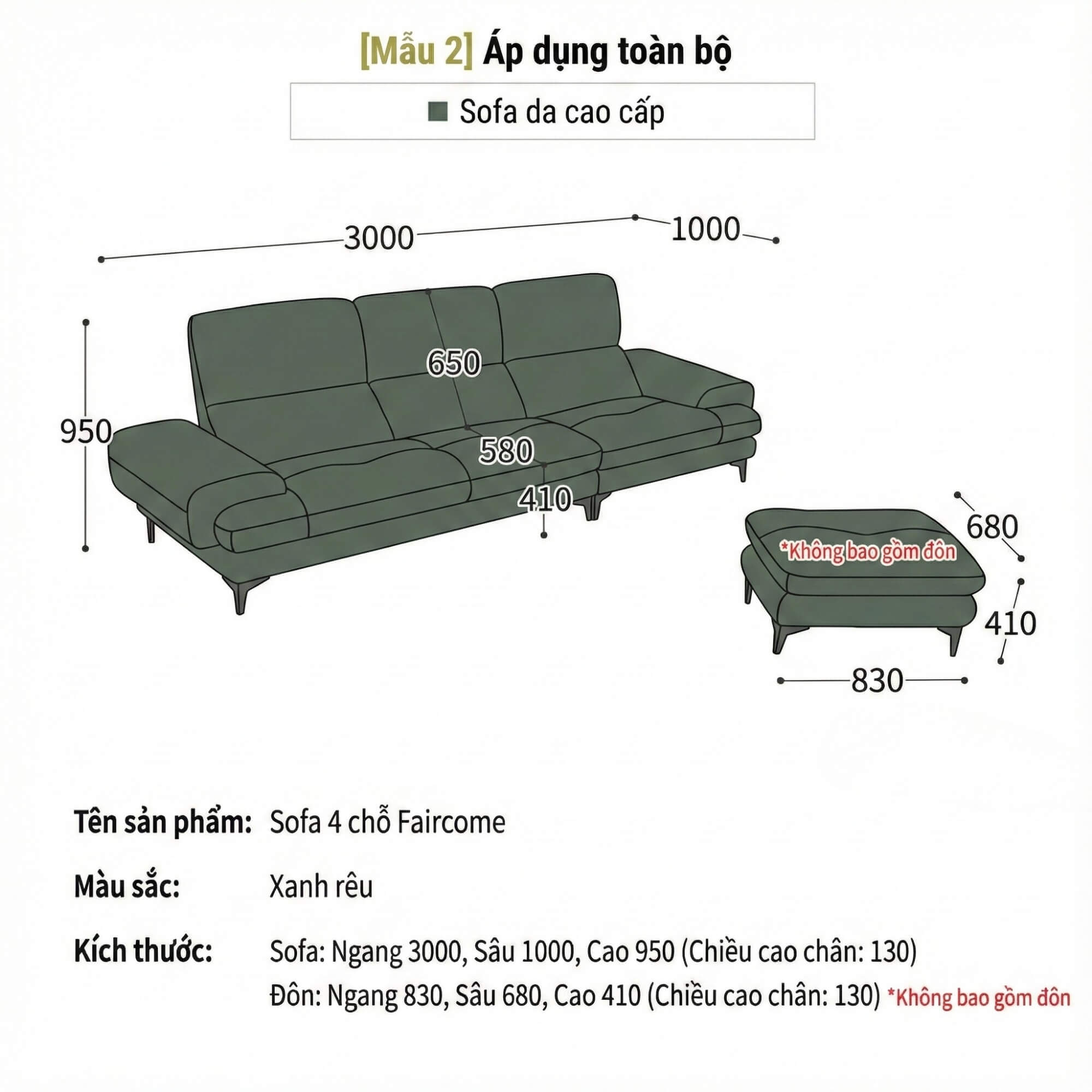- Sofa 4 chỗ Faircome: Ngang 3000mm, Sâu 1000mm, Cao 950mm (Chiều cao chân: 130mm)