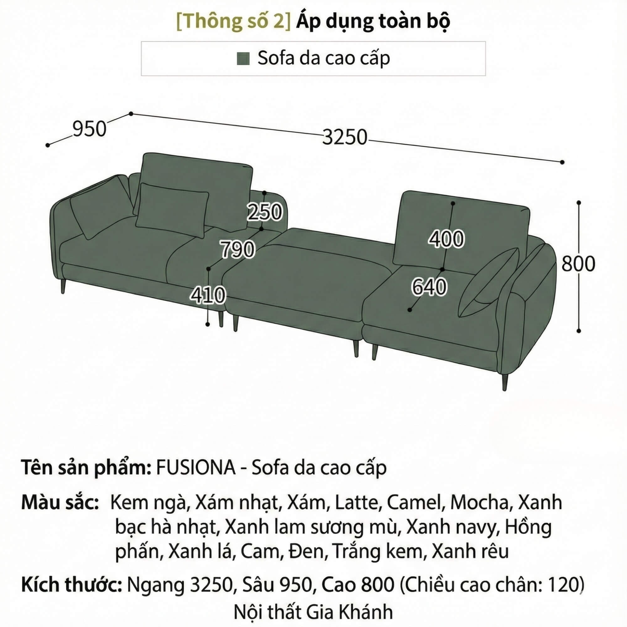 Với kích thước 4 chỗ ngồi phổ biến, sofa FUSIONA có chiều rộng 3250mm – kích thước lý tưởng cho hầu hết các phòng khách hiện đại. Chiều cao chân ghế 120mm vừa đủ để tạo cảm giác thoáng không gian mà vẫn đảm bảo sự vững chắc.