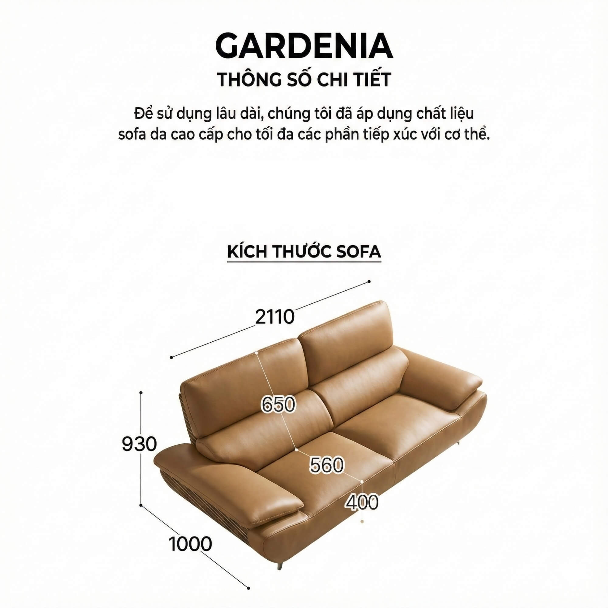 Với kích thước W2110 x D1000 x H930mm, sofa GARDENIA chiều ngang 2110mm – vừa đủ rộng rãi cho không gian phòng khách, không gây chật chội. Đây là kích thước lý tưởng cho các căn hộ hiện đại, phù hợp với xu hướng tối ưu không gian sống.