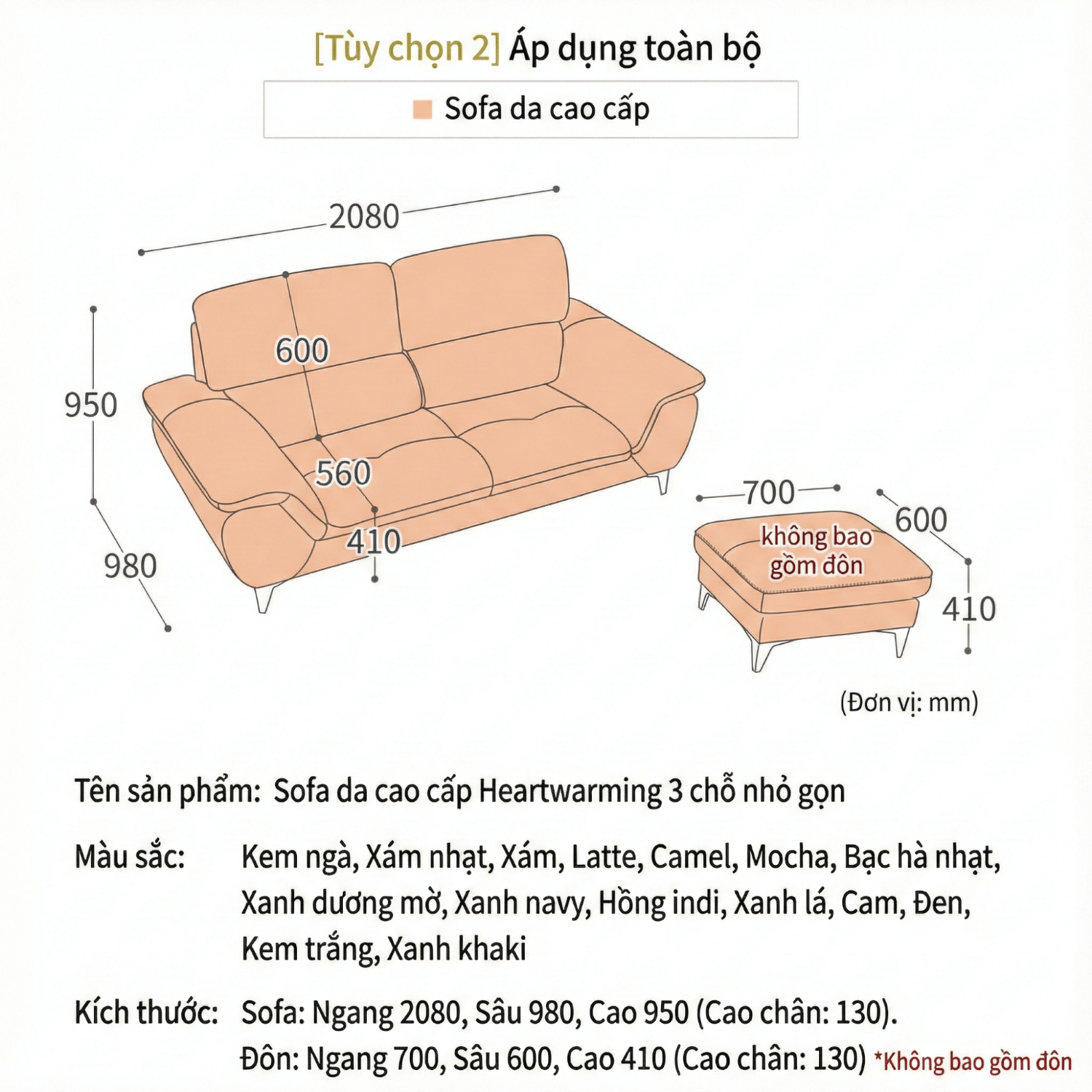 Kích thước sofa: Ngang 2080mm, Sâu 980mm, Cao 950mm (Cao chân: 130mm)