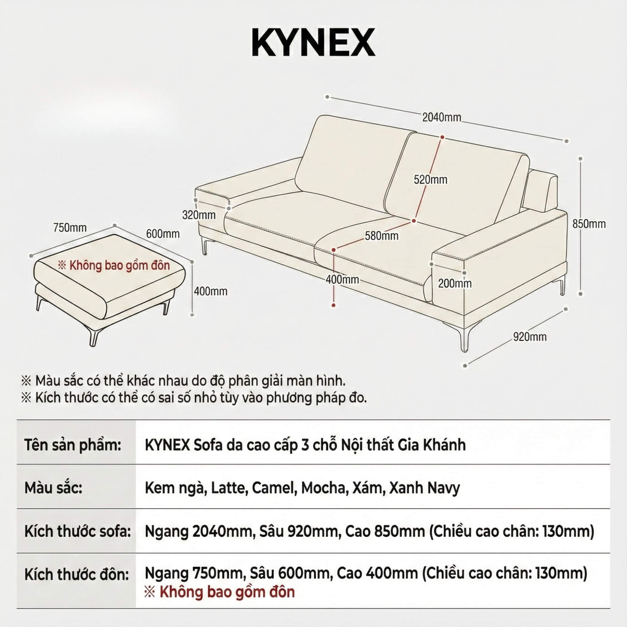 - Sofa KYNEX 3 chỗ ngang: 2,040mm