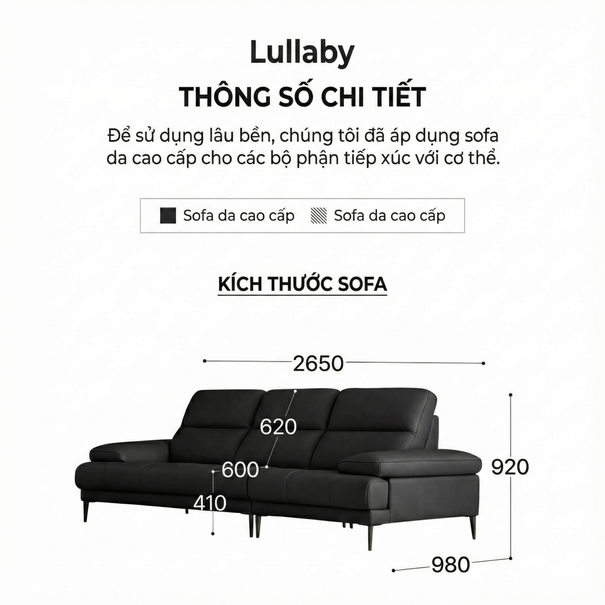 Với kích thước chiều ngang 2650mm, chiều sâu 980mm và chiều cao 920mm, sofa LULLABY được thiết kế vừa đủ lớn để tạo sự thoải mái nhưng không quá cồng kềnh. Đây là kích thước lý tưởng cho các phòng khách hiện đại, giúp tạo không gian rộng rãi và thoáng đãng.