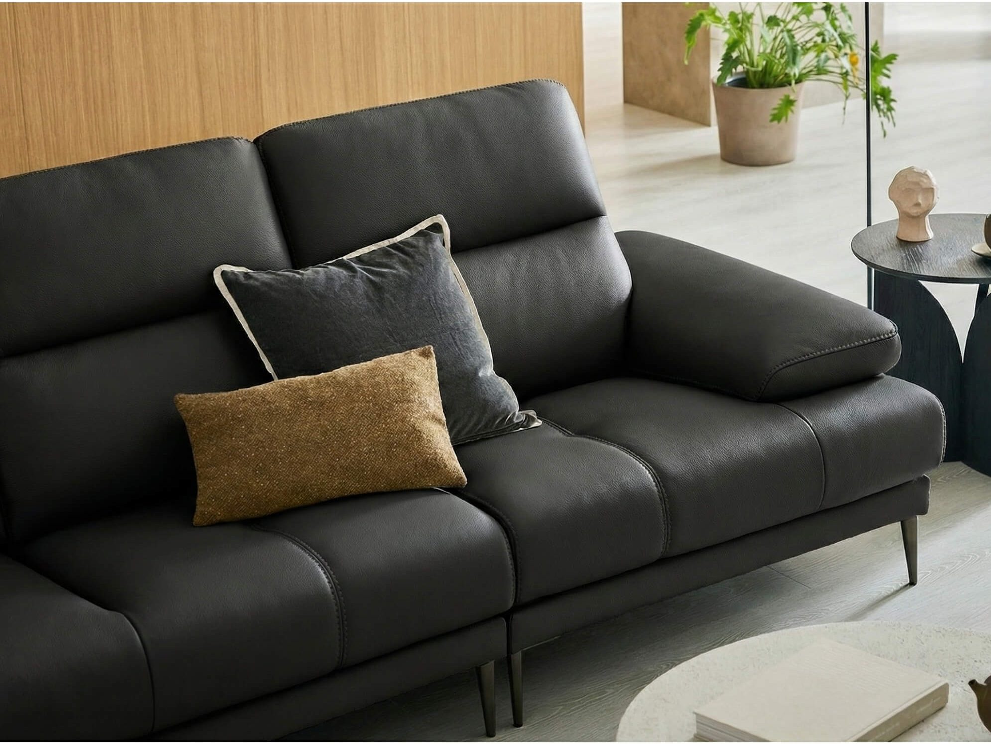 Sofa LULLABY sử dụng chất liệu da cao cấp độc quyền của Nội thất Gia Khánh, được tuyển chọn kỹ càng để đảm bảo độ bền và tính thẩm mỹ. Bề mặt da mềm mại, mịn màng, tạo cảm giác thoải mái khi tiếp xúc. Đường khâu kép trên đệm ngồi không chỉ tăng thêm độ bền cho sofa phòng khách mà còn tạo nên điểm nhấn tinh tế, mang lại vẻ đẹp sang trọng cho tổng thể thiết kế.