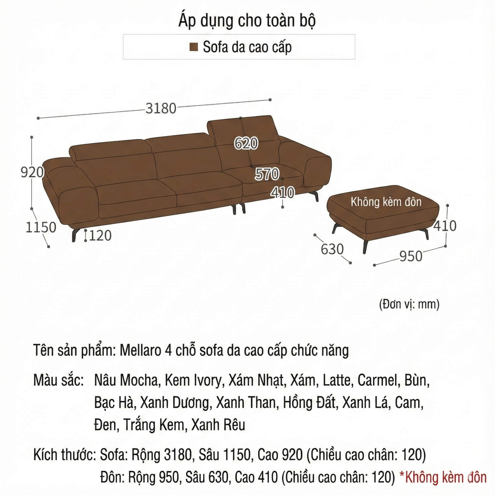 - Kích thước: Rộng 3180mm x Sâu 1150mm x Cao 920mm (Chiều cao chân: 120mm)