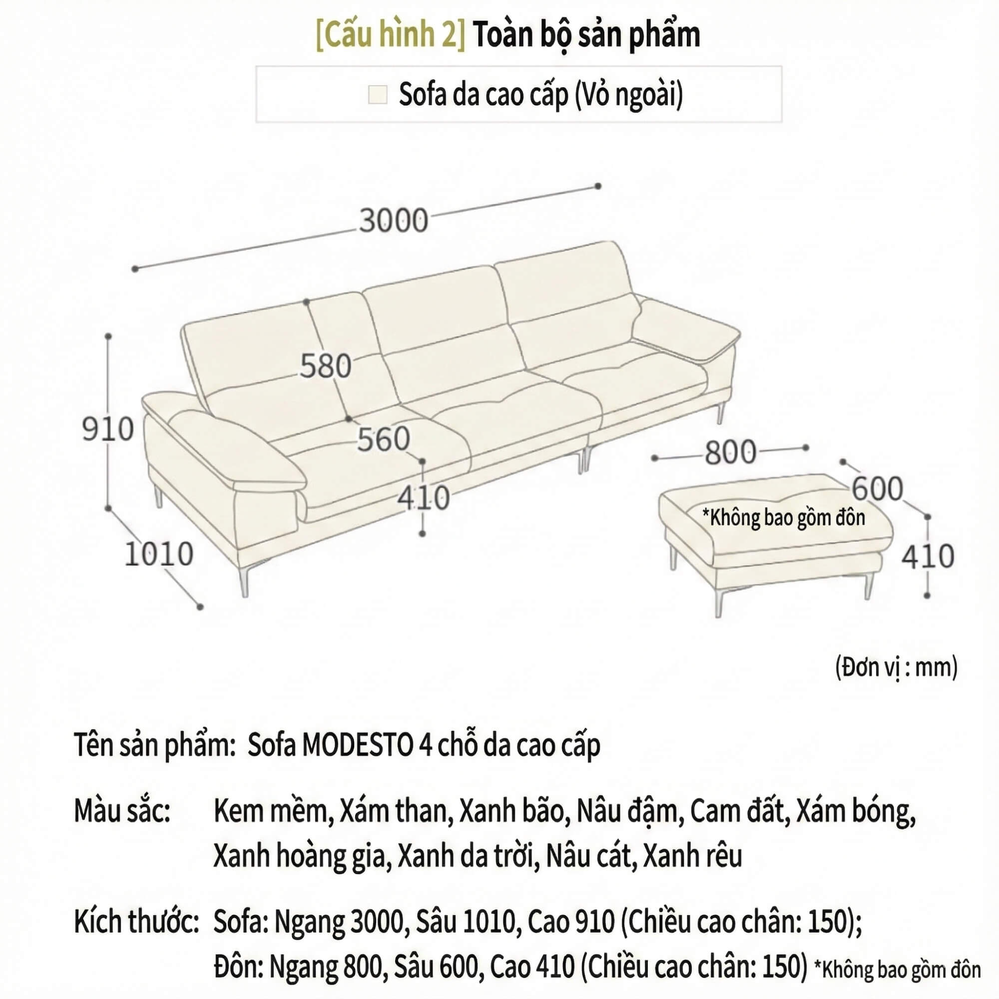 - Sofa chính: Ngang 3000mm x Sâu 1010mm x Cao 910mm (Chiều cao chân: 150mm)