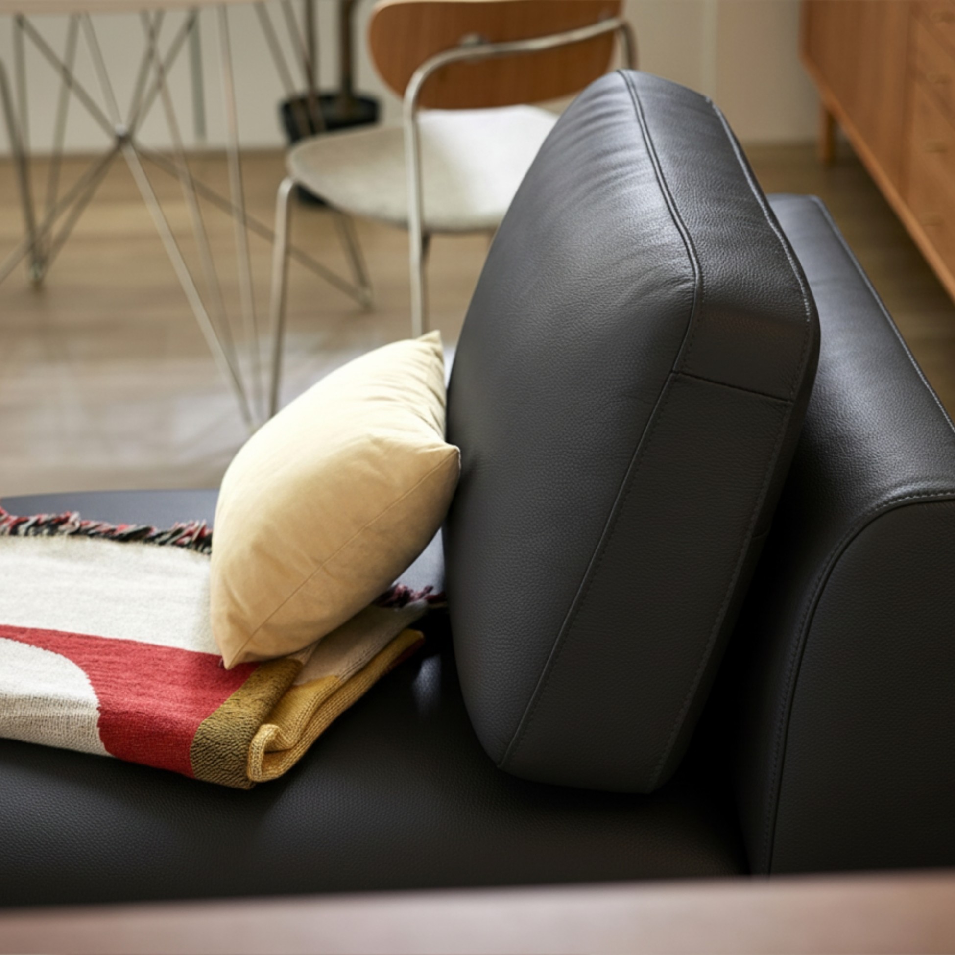 Đệm ngồi thiết kế tối giản đường may, mang lại sự thoải mái khi ngồi và nằm. Bề mặt da cao cấp mềm mại, êm ái, mang đến trải nghiệm thư giãn tuyệt vời sau những giờ làm việc căng thẳng.