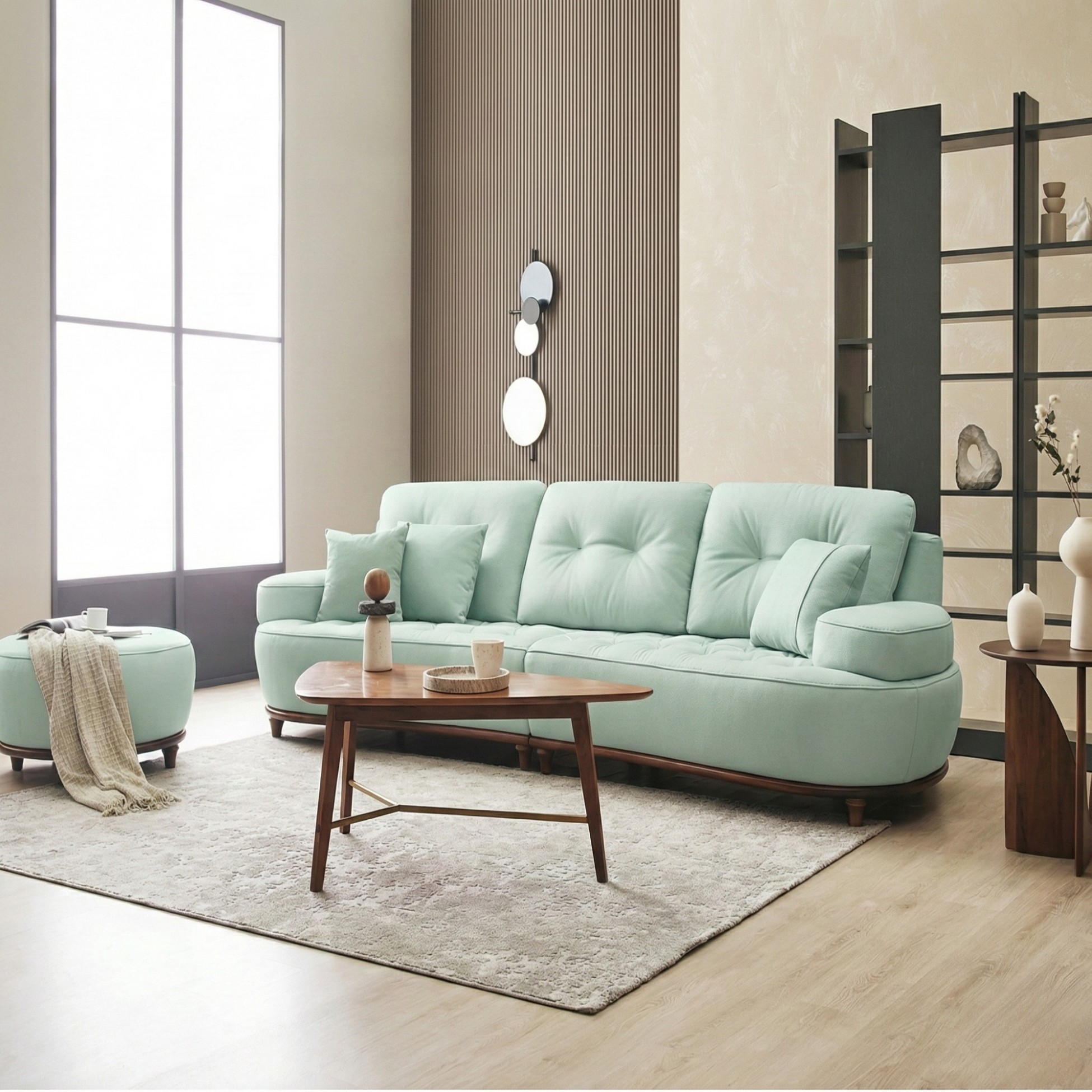 Bộ sản phẩm bao gồm sofa băng 4 chỗ và ghế đôn tròn di chuyển tự do (có thể đặt mua riêng). Chiếc ghế đôn tròn da nâng này mang lại sự đồng nhất với bộ sofa nhờ điểm nhấn nút chần tinh tế. Đế chân được gắn cao su chống trầy xước, đảm bảo an toàn cho sàn nhà khi di chuyển.