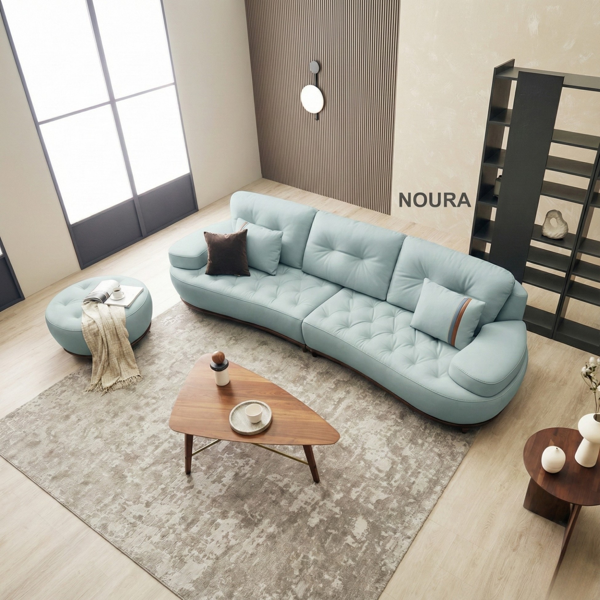 Sofa NOURA gây ấn tượng ngay từ cái nhìn đầu tiên với thiết kế bo tròn mềm mại, tạo nên vẻ ngoài độc đáo và không gian ngồi rộng rãi. Những đường cong được chế tác tỉ mỉ không chỉ mang lại tính thẩm mỹ cao mà còn giúp tạo nên một không gian cuốn hút, biến phòng khách của bạn thành nơi thư giãn lý tưởng sau những giờ làm việc căng thẳng.