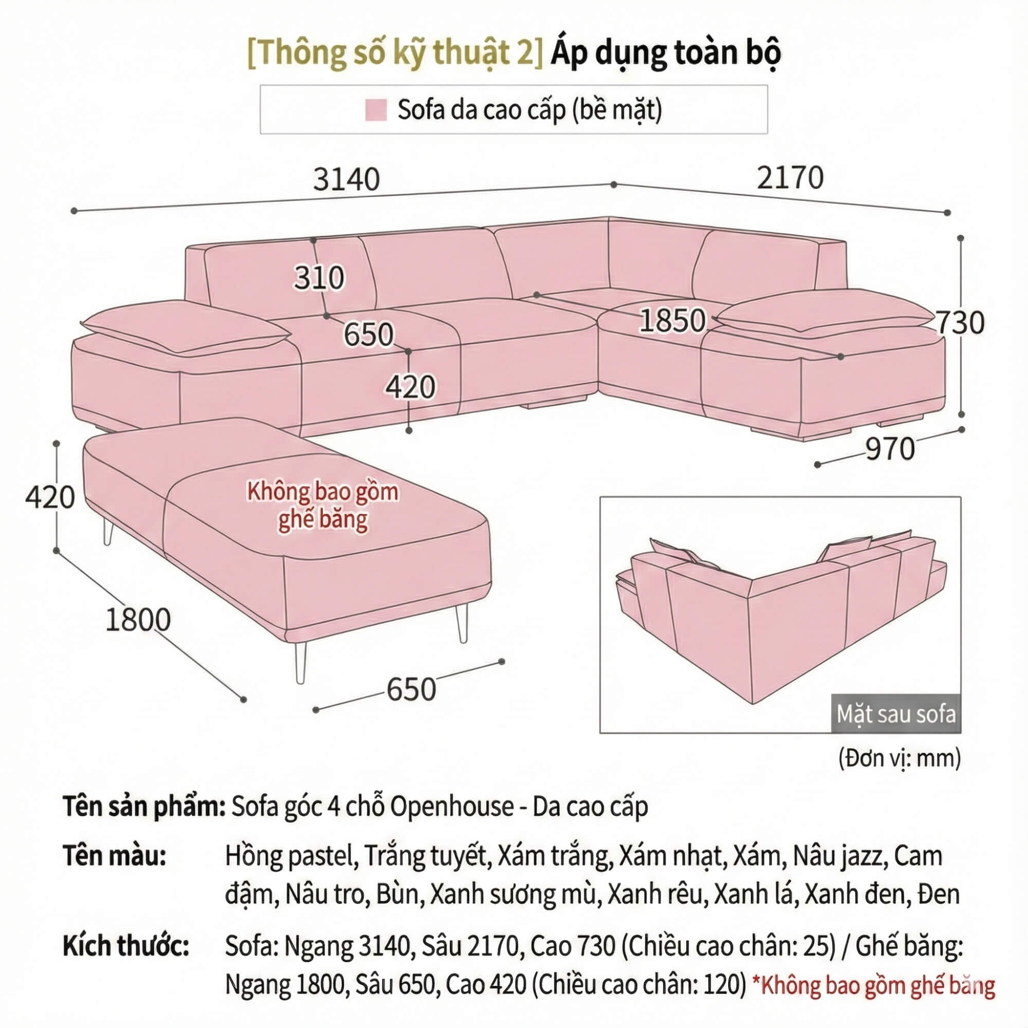 - Sofa chính: Ngang 3140mm, Sâu 2170mm, Cao 730mm (Chiều cao chân: 25mm)