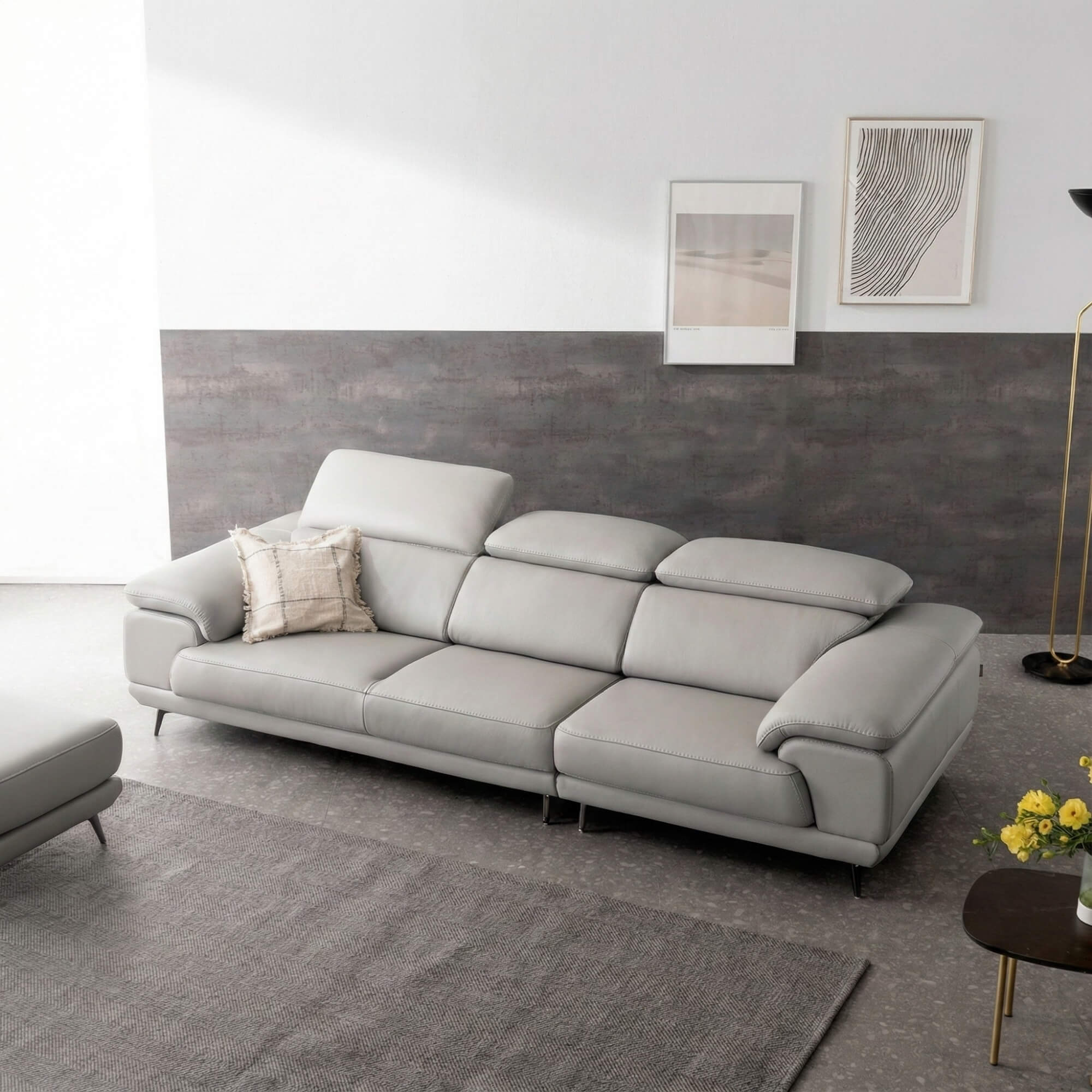 Một trong những điểm nổi bật nhất của sofa ROWAN chính là hệ thống tựa đầu điều chỉnh đa cấp độ lên đến 45 độ. Bạn có thể ngả người thư giãn xem phim, đọc sách hay thậm chí chợp mắt một giấc ngắn – tất cả đều được hỗ trợ tối ưu bởi tựa lưng linh hoạt này. Điều chỉnh theo sở thích cá nhân chỉ với một thao tác đơn giản, giúp bạn tìm được tư thế ngồi hoặc nằm thoải mái nhất.