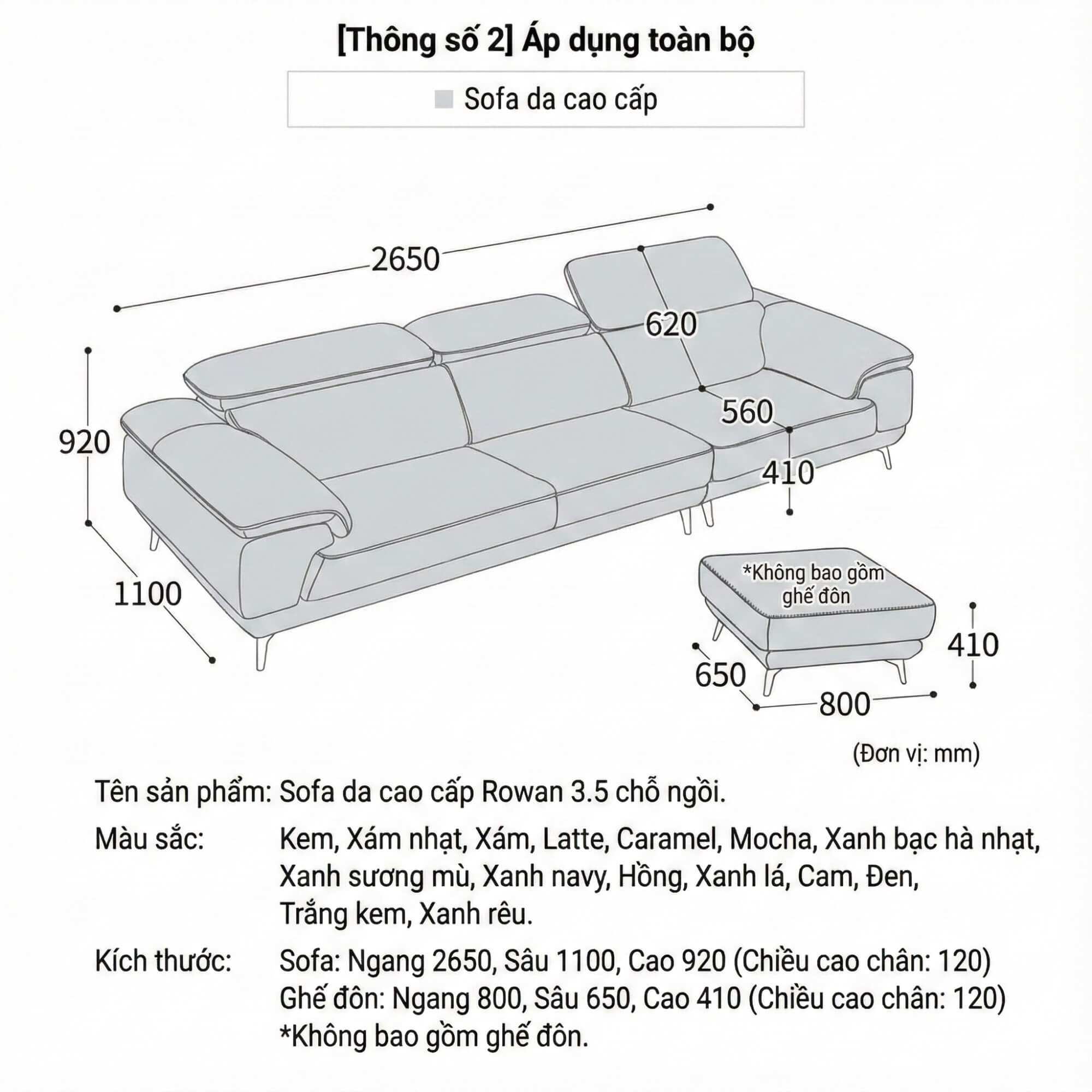 Ví dụ với mẫu Sofa ROWAN 3.5 chỗ ngồi: