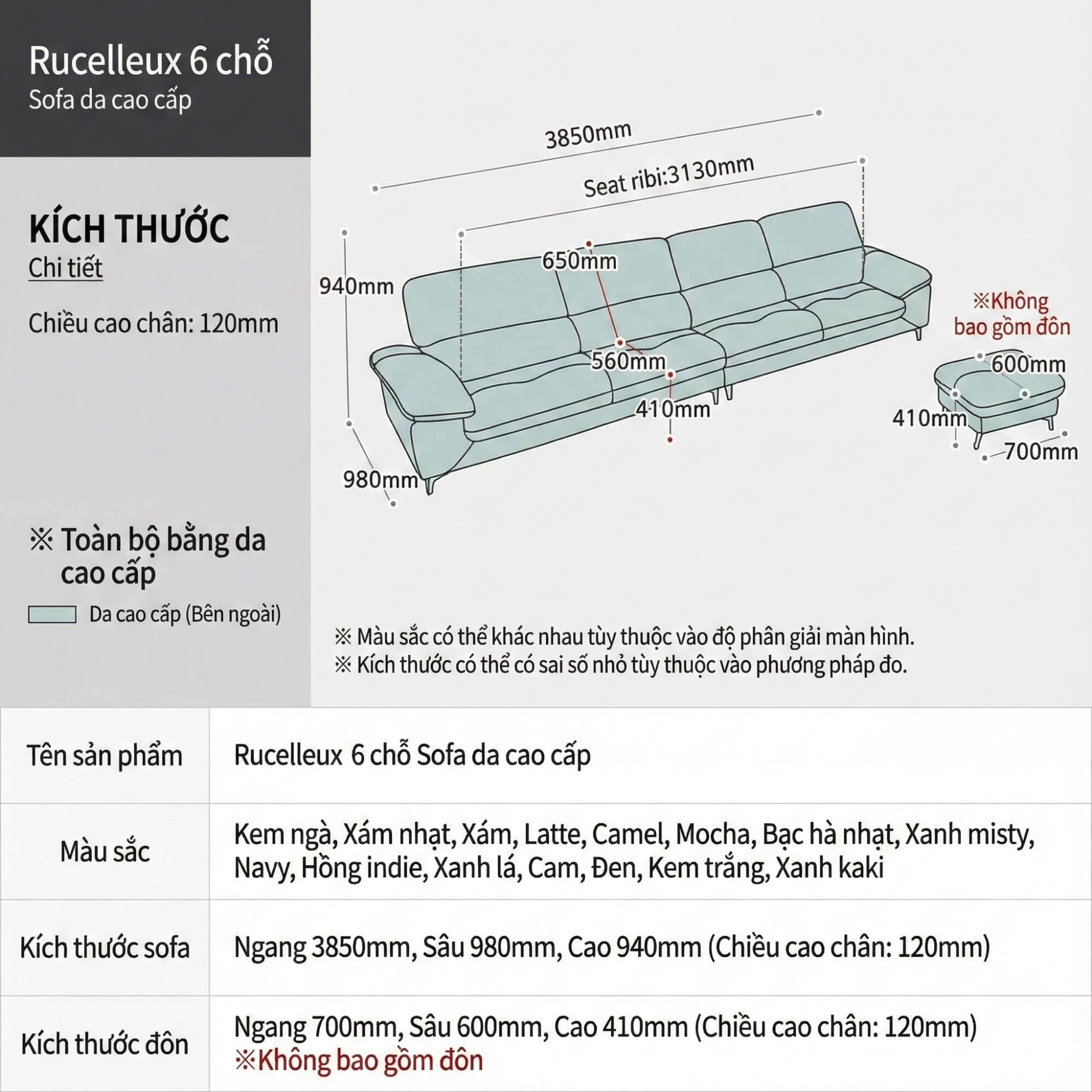 - Sofa RUCELLEUX 6 chỗ ngồi: Chiều ngang 3850mm – Dành cho gia đình đông người hoặc phòng khách 30-40m²