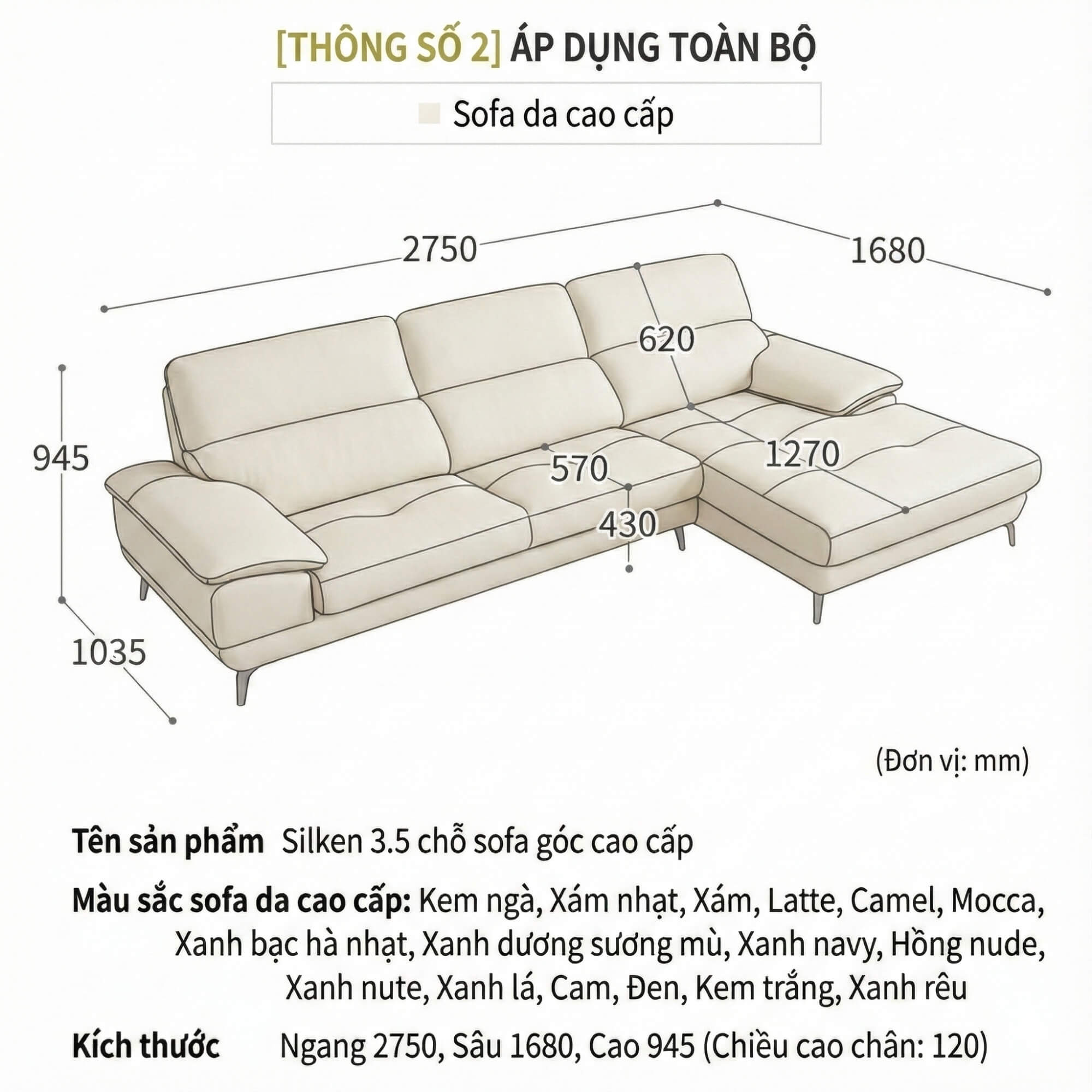 Với kích thước Ngang 2750mm, Sâu 1680mm, Cao 945mm (Chiều cao chân: 120mm), SILKEN II là lựa chọn lý tưởng cho những phòng khách có diện tích từ 20m² trở lên. Kích thước này không quá cồng kềnh nhưng vẫn đảm bảo không gian ngồi thoải mái cho 4-5 người, phù hợp với đa số các gia đình Việt Nam hiện nay.