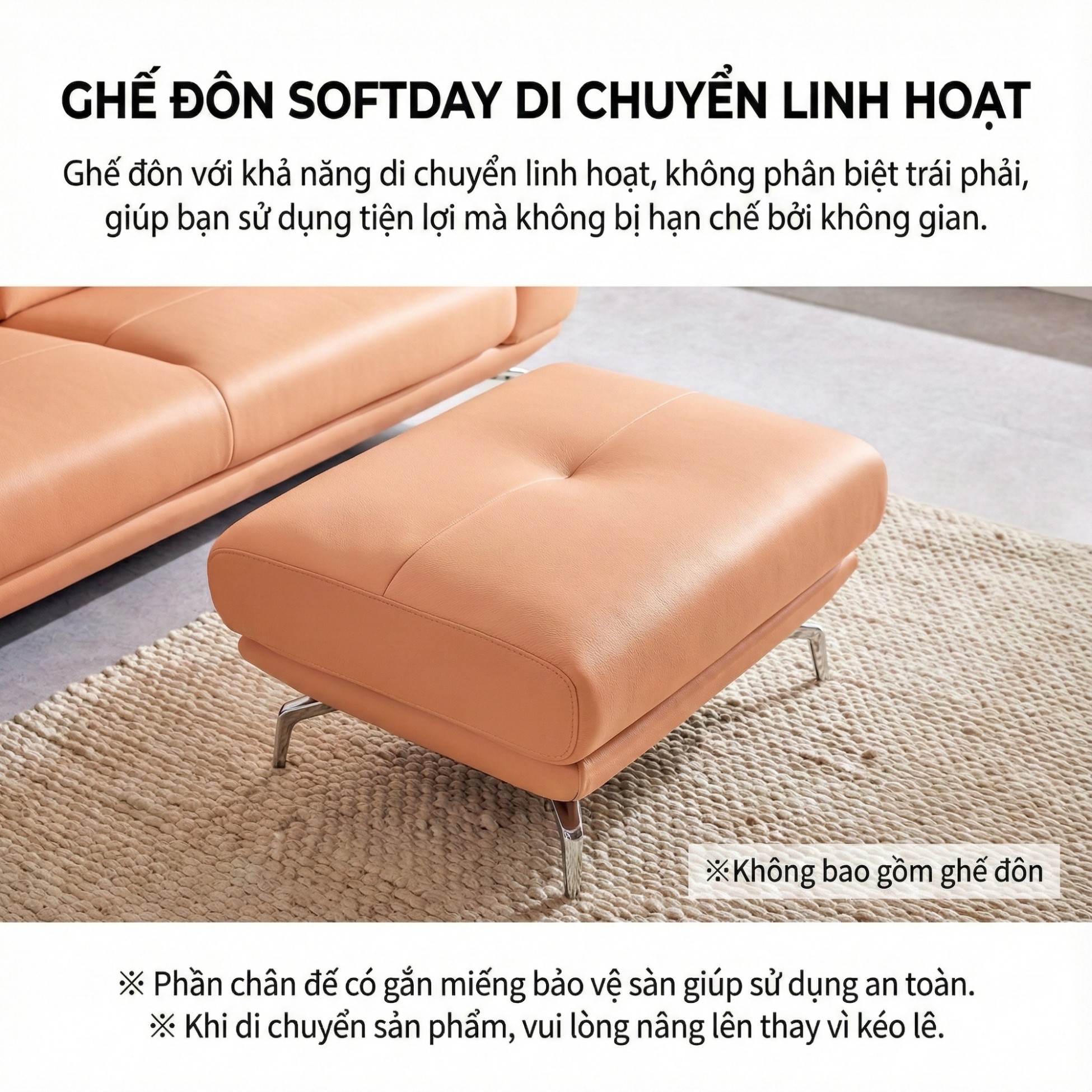 Ghế đôn của sofa SOFTDAY được trang bị khả năng di chuyển linh hoạt, không phân biệt trái phải, giúp bạn sử dụng tiện lợi mà không bị hạn chế bởi không gian. Đệm ghế có thể tháo rời để dễ dàng vệ sinh và bảo quản, giúp sofa luôn sạch sẽ trong thời gian dài.