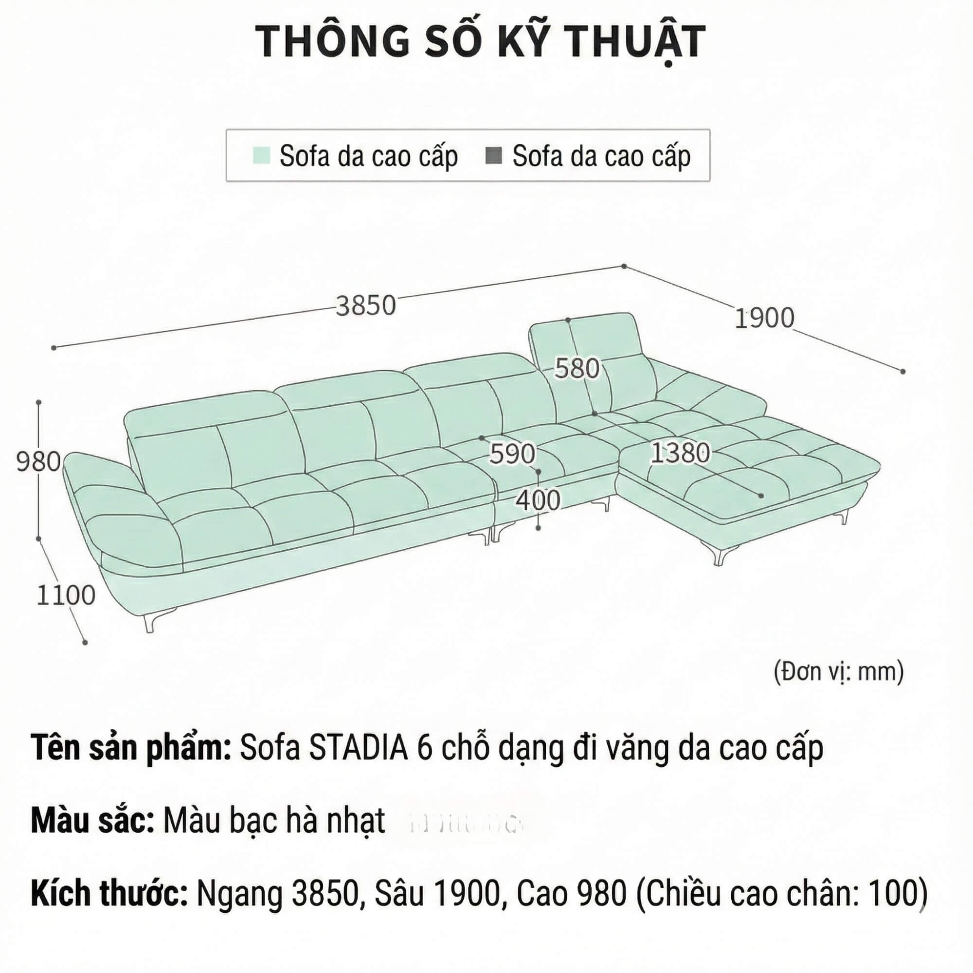 - Cao: 980mm (Chiều cao chân: 100mm)