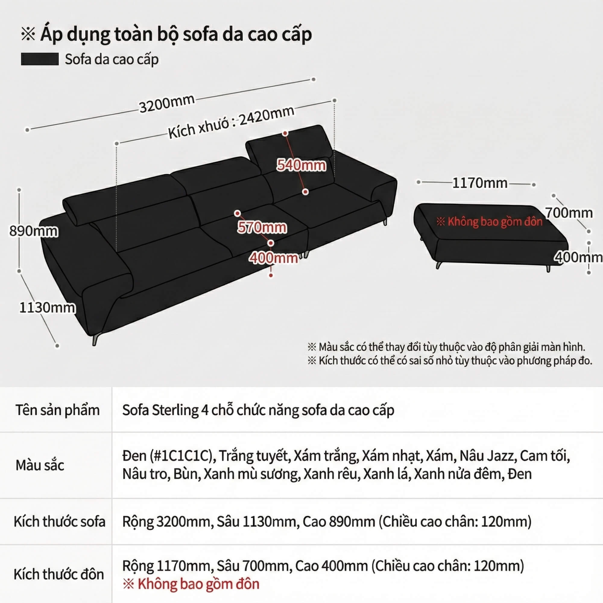 Sofa góc Sterling với kích thước rộng 3200mm, sâu 1130mm, cao 890mm cùng đôn rộng 1170mm, sâu 700mm, cao 400mm – phù hợp với hầu hết các phòng khách từ 20m² trở lên.