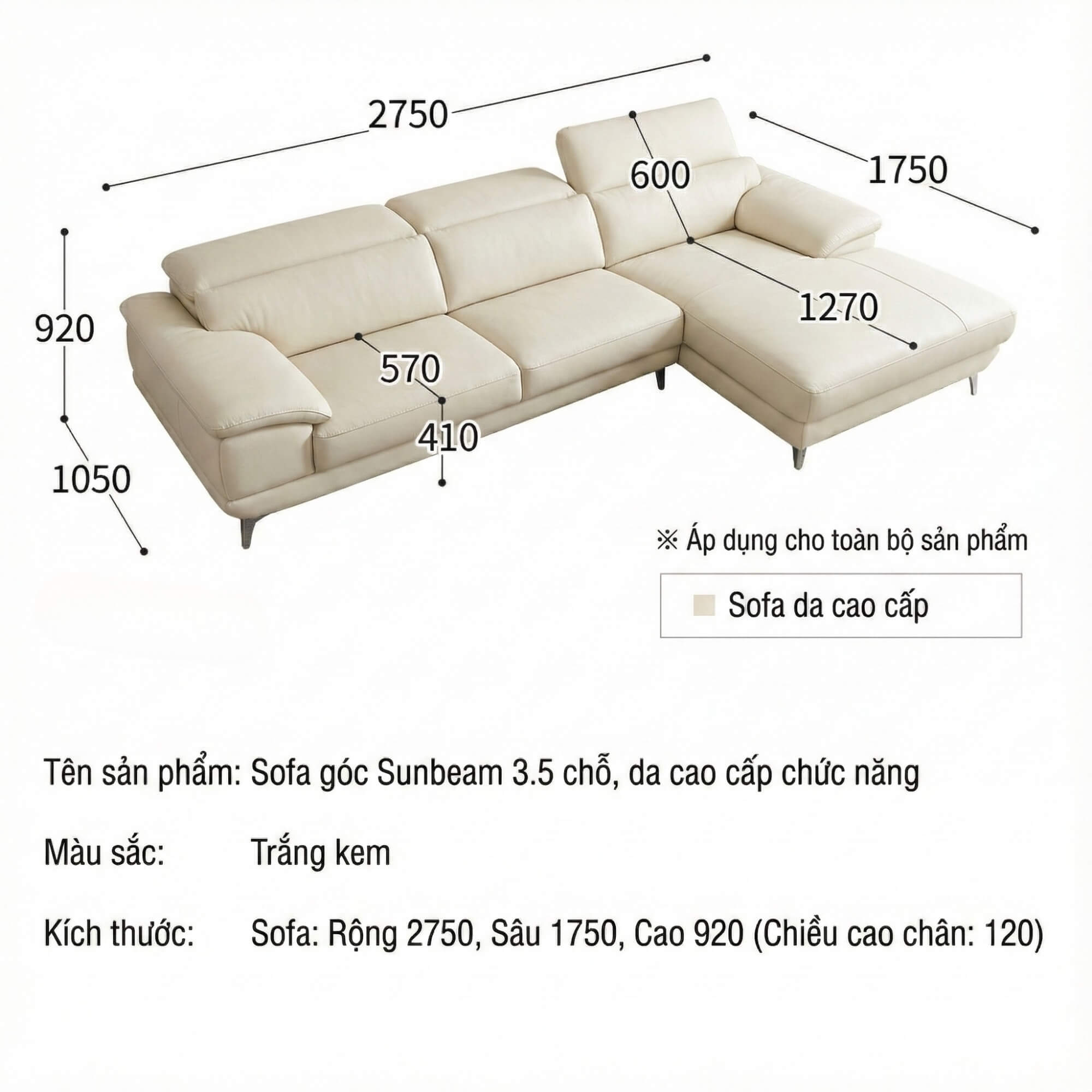 - Tên sản phẩm: Sofa góc SUNBEAM 3.5 chỗ, da cao cấp chức năng