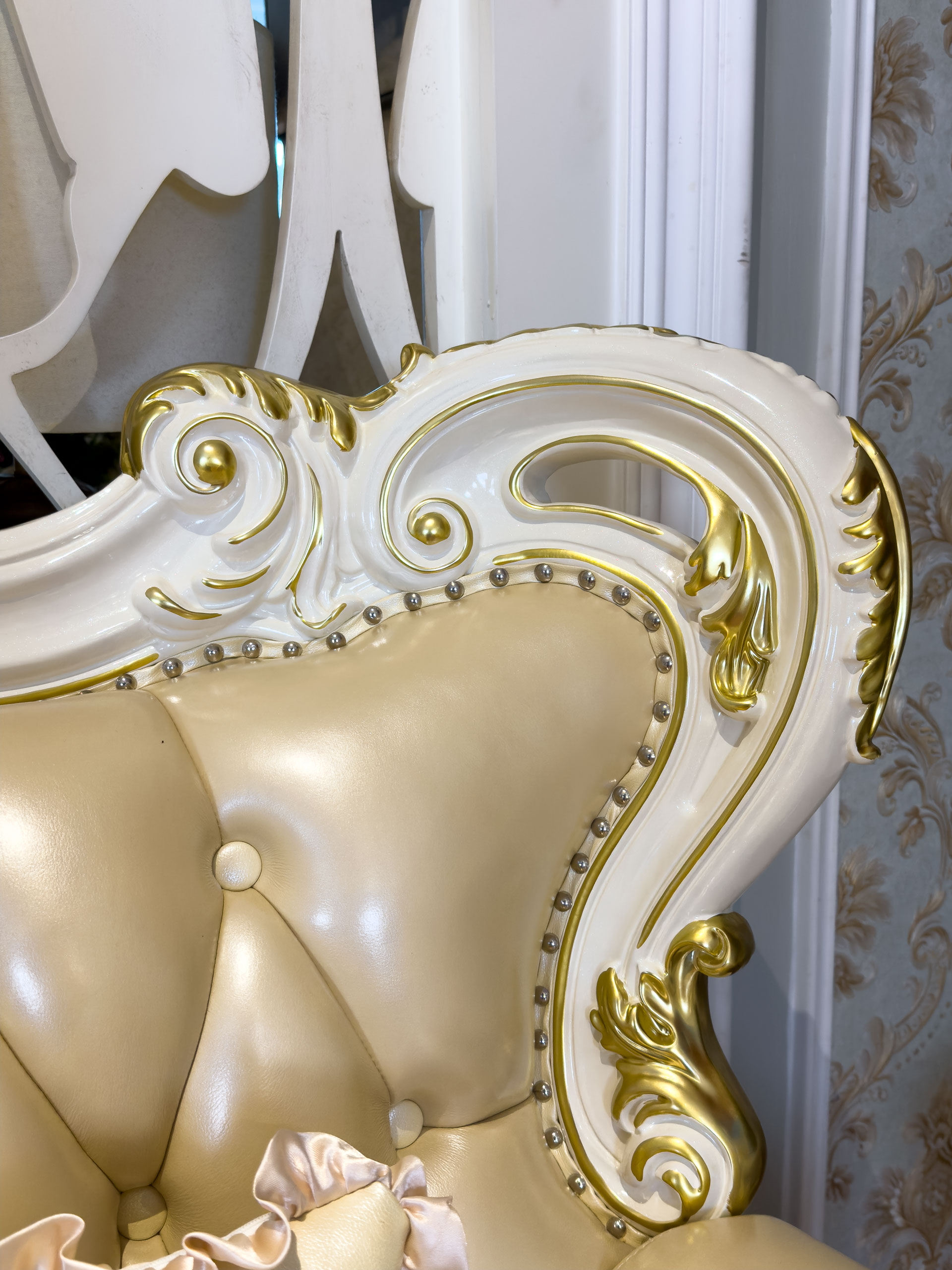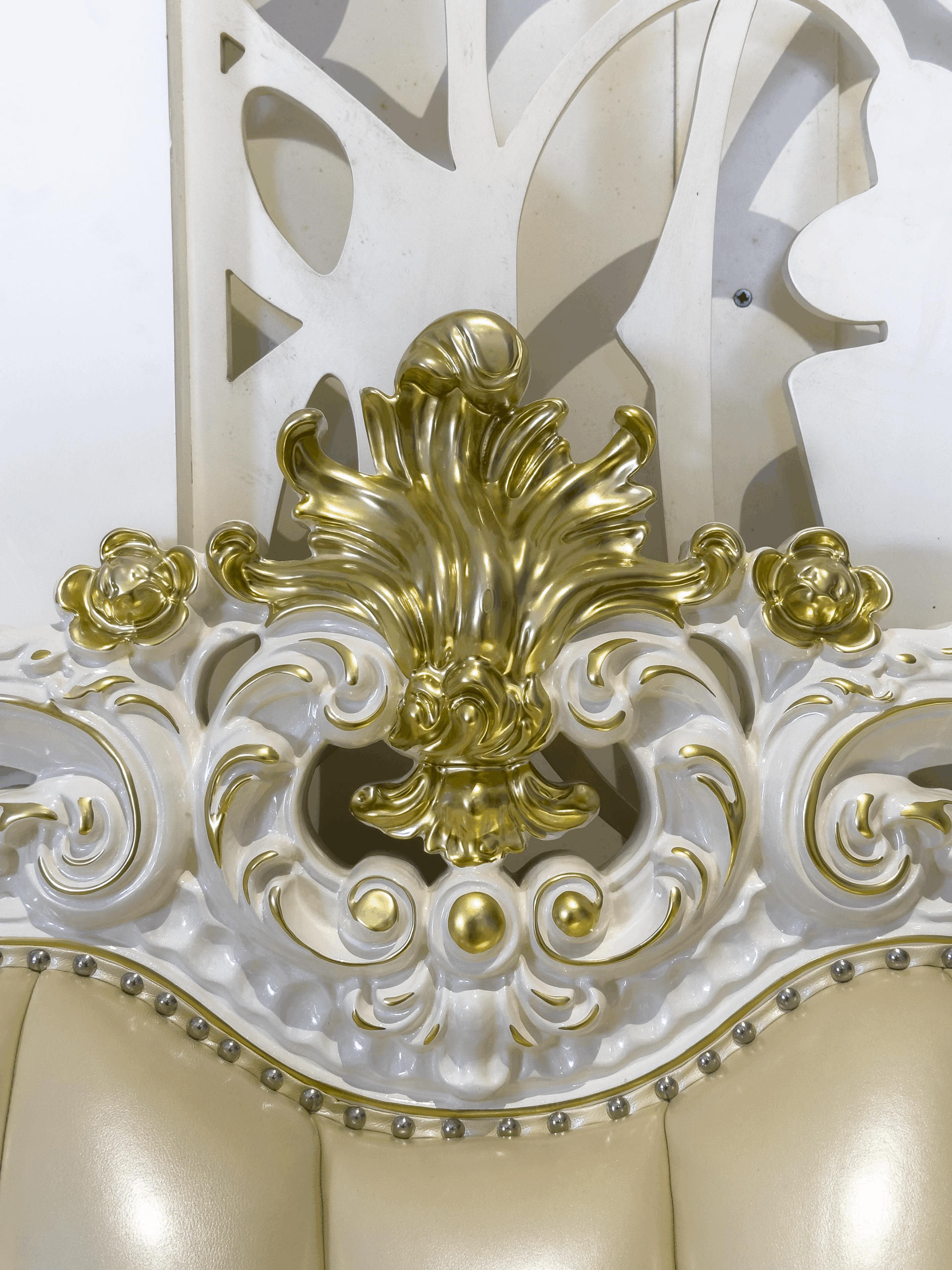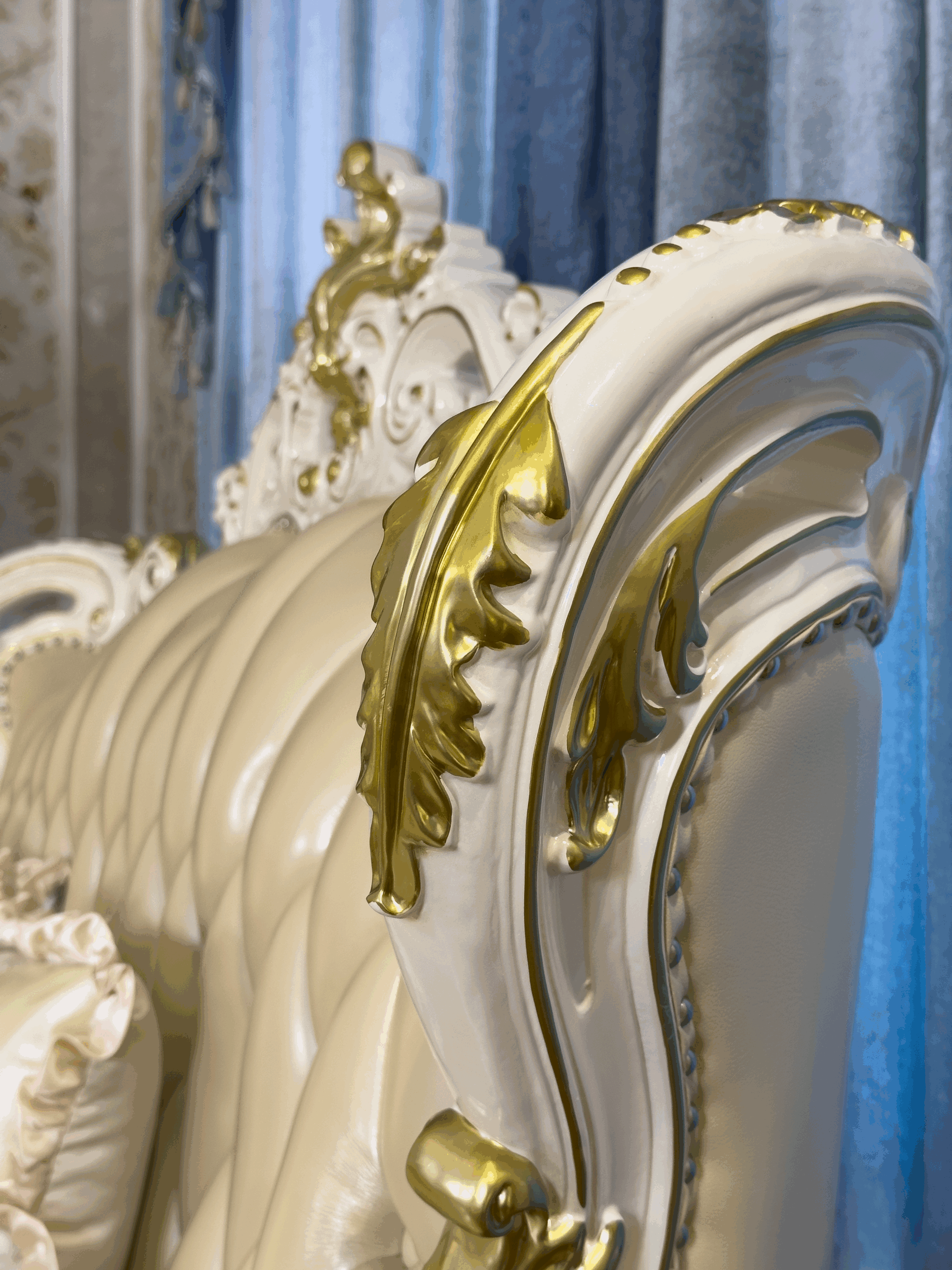 | Chất liệu | Khung gỗ Sồi tự nhiên, Bọc da bò tự nhiên toàn bộ bề mặt tiếp xúc, Sơn Lacker 7 lớp công nghệ sơn Oto, Họa tiết nhũ vàng. |