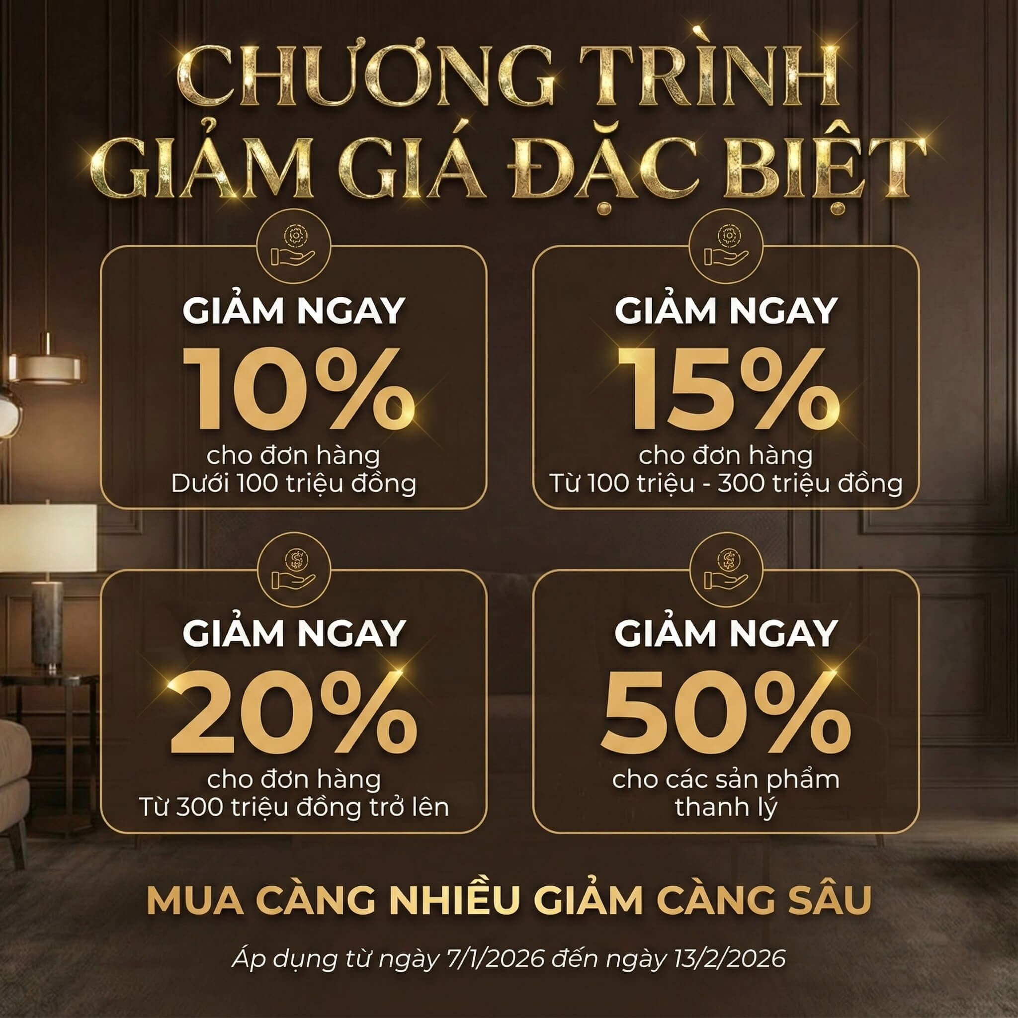 Đây là cơ hội không thể bỏ lỡ để sở hữu những thiết kế nội thất đẳng cấp với mức giá hấp dẫn chưa từng có. Chương trình ưu đãi theo giá trị đơn hàng cụ thể như sau: